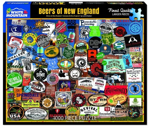 1378 Beers of New England. We northern folk enjoy our beer, whether it’s in front of the fire after a day of skiing or at the fishing hole in summertime. Designer Lois B. Sutton has assembled an array of colorful labels on this 1,000 piece puzzle, including the nearest craft brewer to us at White Mountain Puzzles – Tuckerman Brewing Company, located just down the road a piece in Conway NH. Many others with interesting names are also on tap here, like Allagash, Narragansett, Idle Hands, Lefty’s, Revival, Abandoned Building, Gritty’s, Hog, and The Peoples’ Pint. Finished size 24” x 30”.