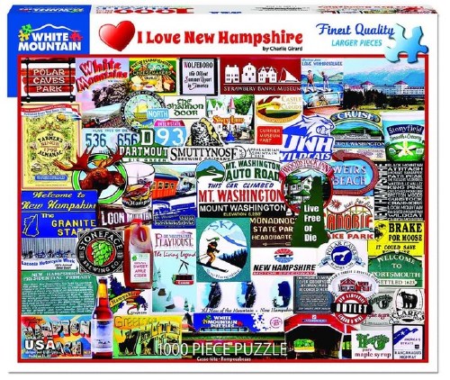 I Love New Hampshire. We Granite Staters are justifiably proud – we’re small, but full of superlatives. Eleven miles north of White Mountain Puzzles is Mount Washington, the highest peak in the northeastern U.S. which, until recently, held the record for the highest wind ever recorded by man – 231 miles per hour. NH is home to Wolfeboro, the oldest summer resort in America, and the first in the nation Presidential Primary. The symbol of the state is the Old Man of the Mountain, the 40’ high rock profile that sadly collapsed in May of 2003. The Old Farmer’s Almanac, published since 1792, is based in Dublin NH. Closer to our Jackson home we have many attractions such as our treasured Covered Bridge, Storyland, the Conway Scenic Railroad, and the Shannon Door Pub (est. 1953). This 1,000 piece collage was designed by Charlie Girard. Finished size 24”x30”.