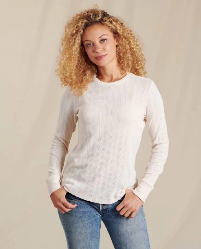 With cute details like a subtle hem along the neckline and pointelle stitching throughout, this spruced-up crew is made from an eco-friendly blend of organic cotton and recycled polyester that brings both texture and coziness to any cool-weather outfit.